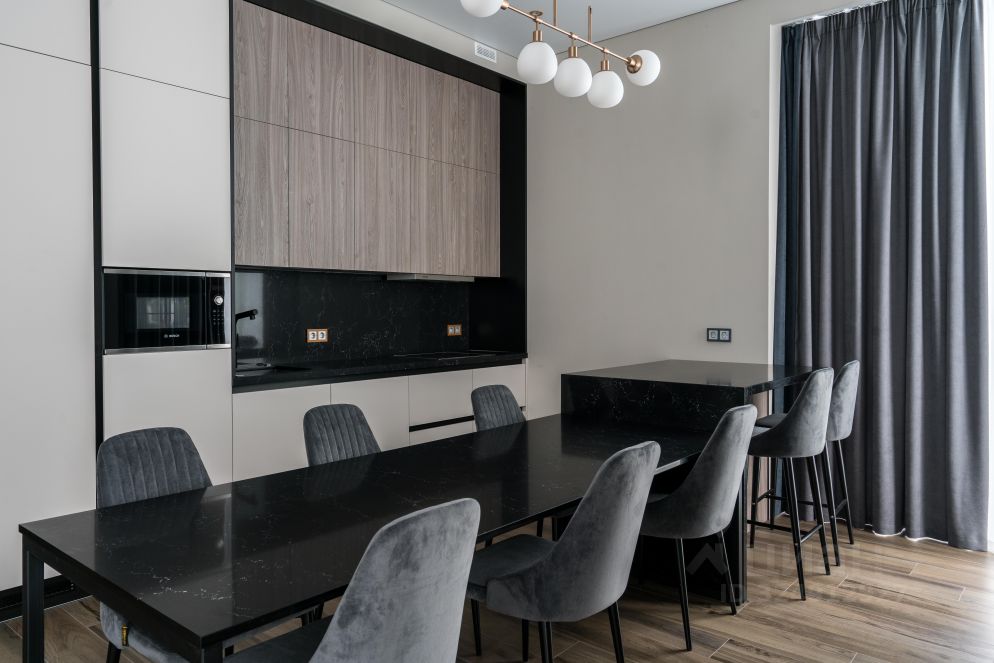Двухуровневая четырёхкомнатная квартира со стильным интерьером и собственной террасой в малоэтажном комплексе бизнес-класса с закрытой охраняемой территорией.