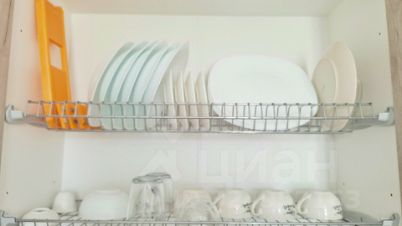 Кухня: плита, холодильник, посудомойка, микроволновая печь, чайник, большое количество места для хранения, посуда для приготовления и еды, обеденный стол, стулья, диван, стеллаж.