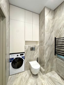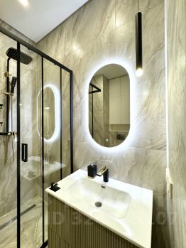 Совмещенный санузел в котором имеется: душевая кабина с тропическим душем, раковина с тумбой , зеркало с подсветкой, стиральная машина - Beko.