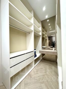 В комнате располагается двуспальная кровать, большая гардеробная с подсветкой и зеркалом, телевизор - Xiaomi, есть французский балкон с окнами в пол.