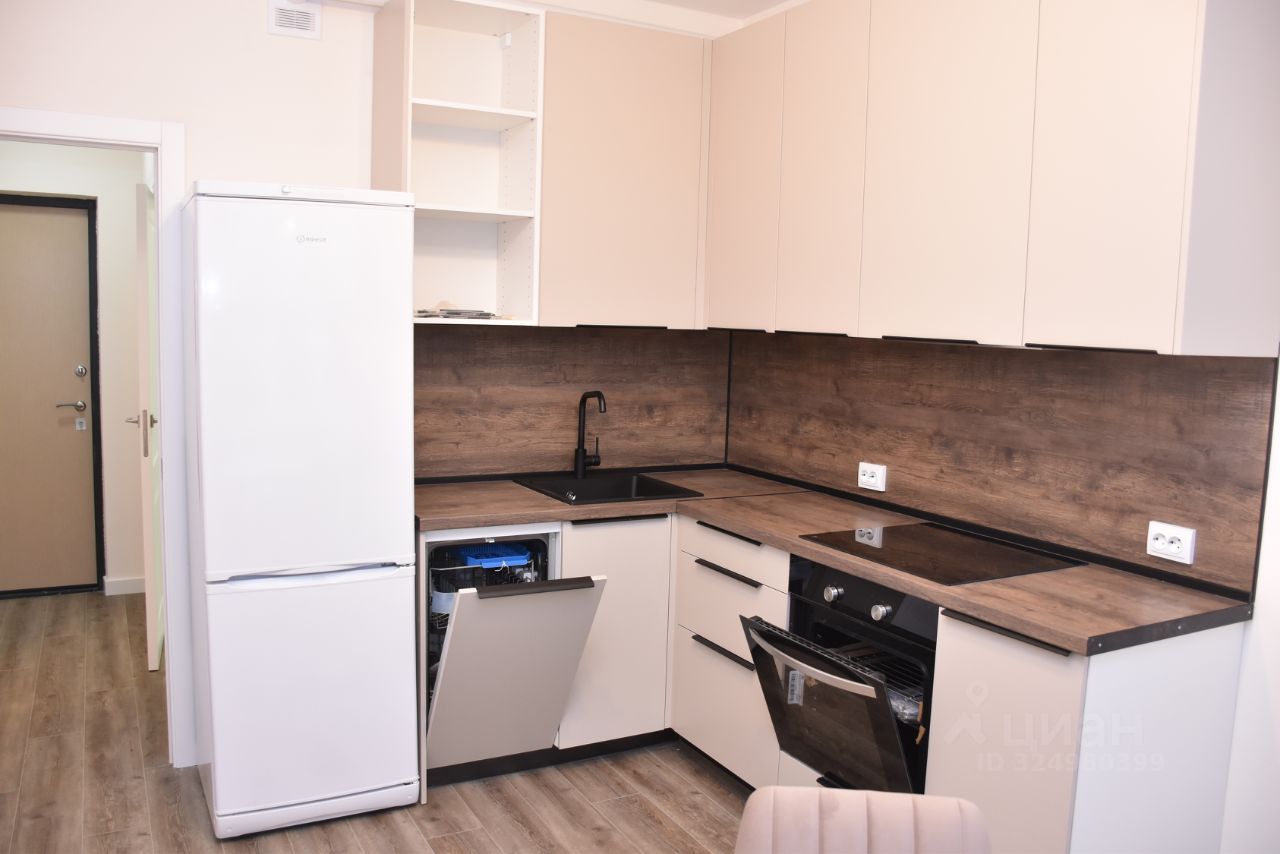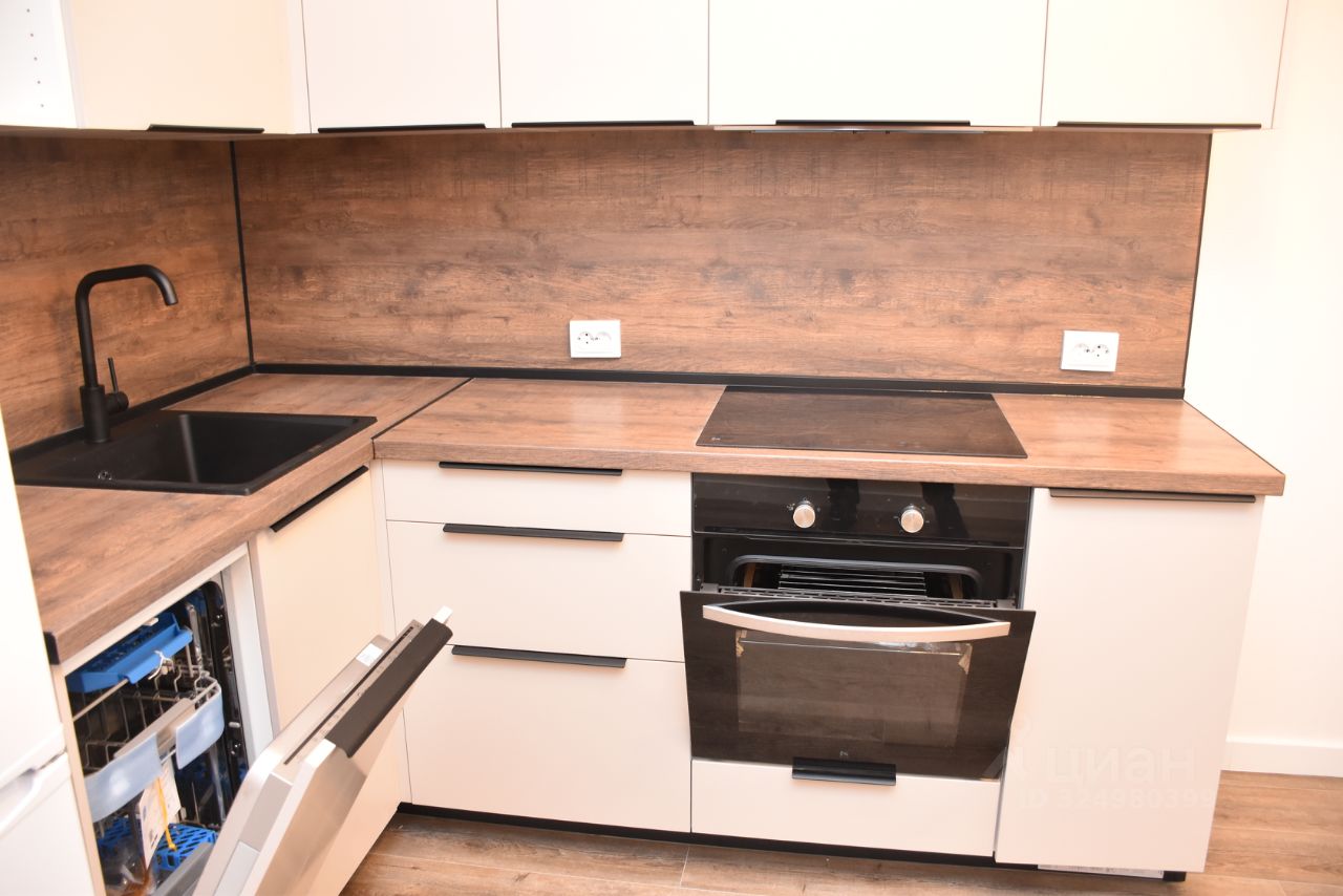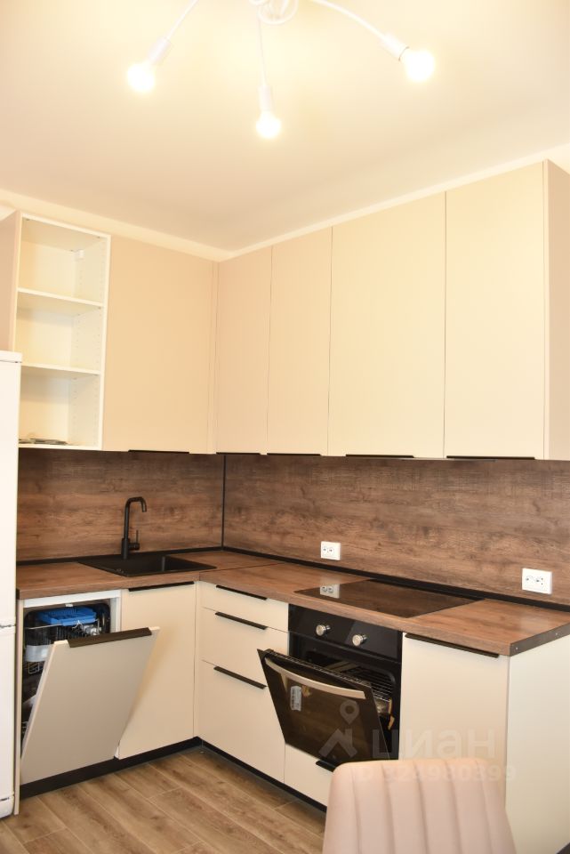 -кухонный гарнитур, холодильник, микроволновая печь, посудомоечная машина, обеденный стол, стулья,