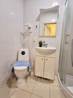 Собственная ванная комната - душевая кабина, туалет, фен, зеркало, туалетные принадлежности.