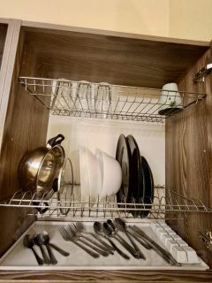 Мини кухня - плита, холодильник, микроволновка, посуда, приборы, чашки, бокалы, френч-пресс, чай, кофе, сахар.