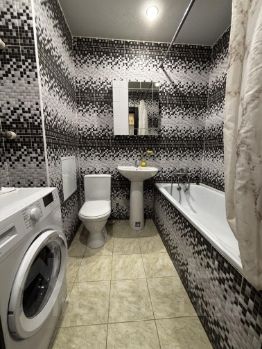 Ванная комната совмещенная, с современной сантехникой и стиральной машиной.