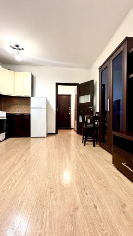 студия с удобной планировкой, теплая, светлая, окна выходят на западную сторону сторону. Большой застекленный балкон с видом во двор. Квартира с полной чистовой отделкой: красивые обои под покраску, ламинат, кафель, межкомнатные двери, стеклопакеты, сантехника. Высокие потолки 2,75м..