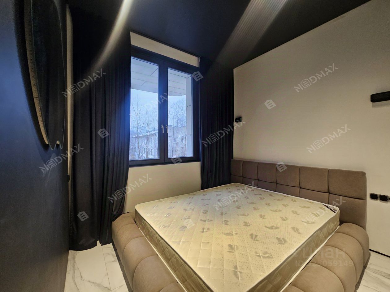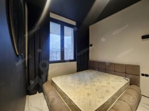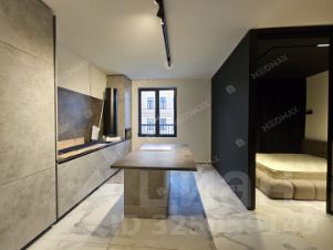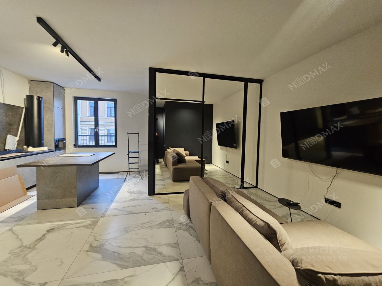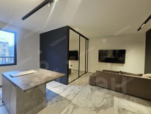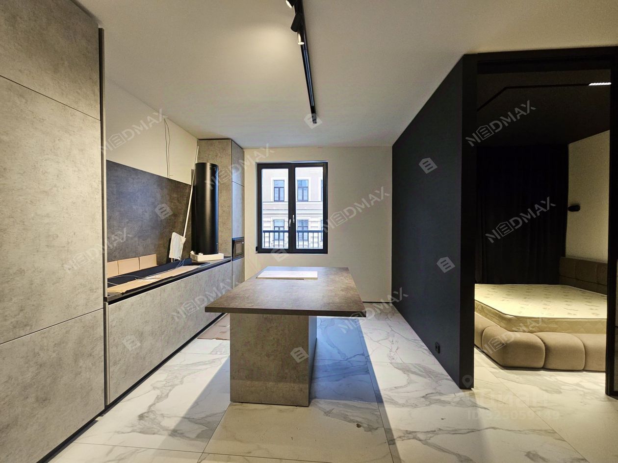 В ближайшее время будет полная комплектация. Зона спальни отделена стеклянной перегородкой. В кухонной зоне еще будет установлена вытяжка. Есть отдельная гардеробная.
