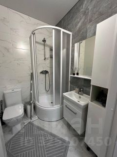 В едином пространстве — кровать у панорамного окна, где удобно читать до глубокой ночи, кухонный гарнитур со всей необходимой техникой и стол, где за чашкой кофе можно смотреть утренние новости. Санузел — светлый и просторный, без хлама на полках.