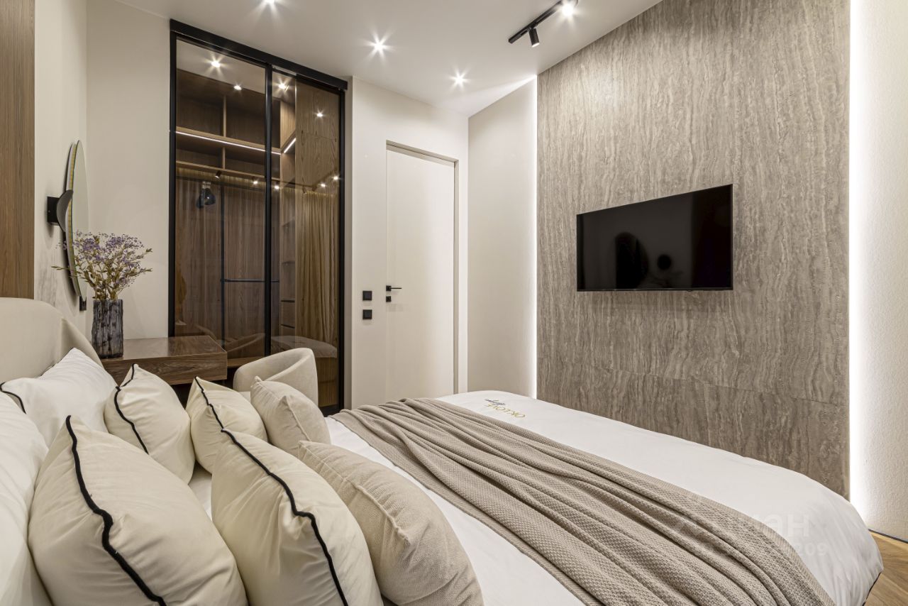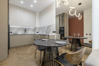 Гардеробная, вместительная кухня, современный санузел с душевой. Квартира полностью укомплектована мебелью и техникой по дизайн-проекту.