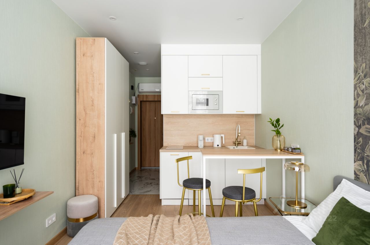 В квартире-студии просторный балкон. Апартаменты оснащены бесключевым доступом, поэтому возможен заезд в любое время после 15:00