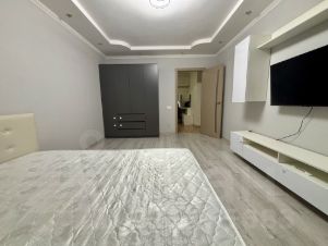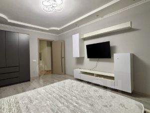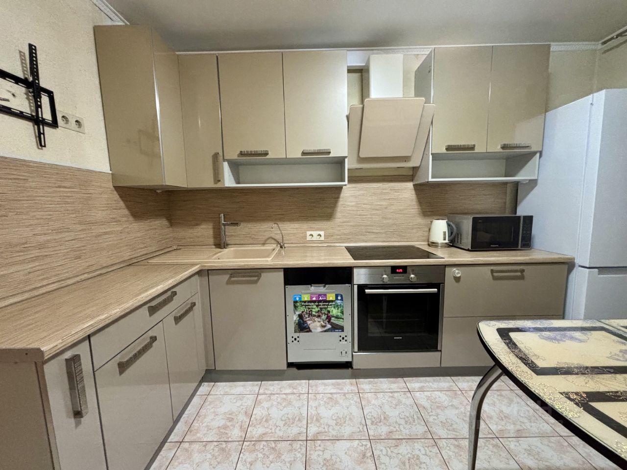 В наличии вся необходимая мебель как на кухне, так и в комнате. В комнате двуспальная кровать, шкаф для одежды, подвесные шкафы для хранения мелочей и документов, телевизор. Кухня площадью 9,8 кв. м оснащена современной техникой: холодильником, варочной поверхностью, духовым шкафом, вытяжкой, посудомоечной машиной, микроволновкой, чайником. Кухонный стол, угловой диван. Ванная комната оборудована полноценной ванной. Есть стиральная машина.Санузел раздельный. В коридоре просторный и вместительный шкаф-купе, комод и косметический столик.