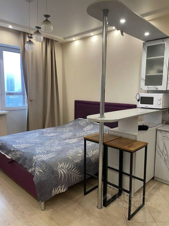 Сдается просторная, видовая квартира-студия. В квартире выполнен качественный ремонт, со множеством мест для хранения. Квартира очень светлая и теплая.