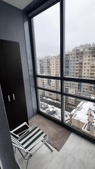 Рулонные шторы на всех окнах лоджии, сушилка для белья.
