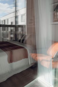 Кровать с ортопедическим матрасом и хлопковым бельем подарит вам полноценный отдых, штора блэкаут обеспечит темноту и здоровый сон.