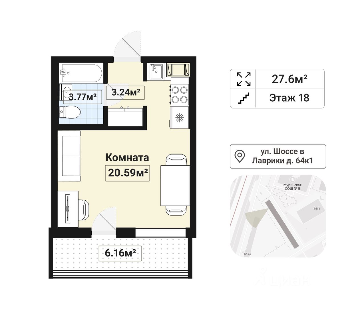 Расположена на 18 этаже нового комфортного ЖК. Полностью готова к проживанию.