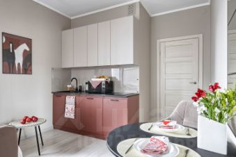 — Кухня со всем необходимым (питьевой фильтр, холодильник, варочная панель, микроволновая печь, чайник, посуда)
