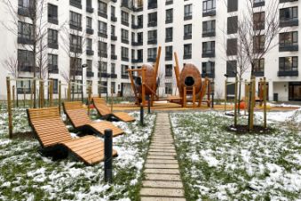 Огороженная охраняемая территория с озеленением и релакс-зонами.