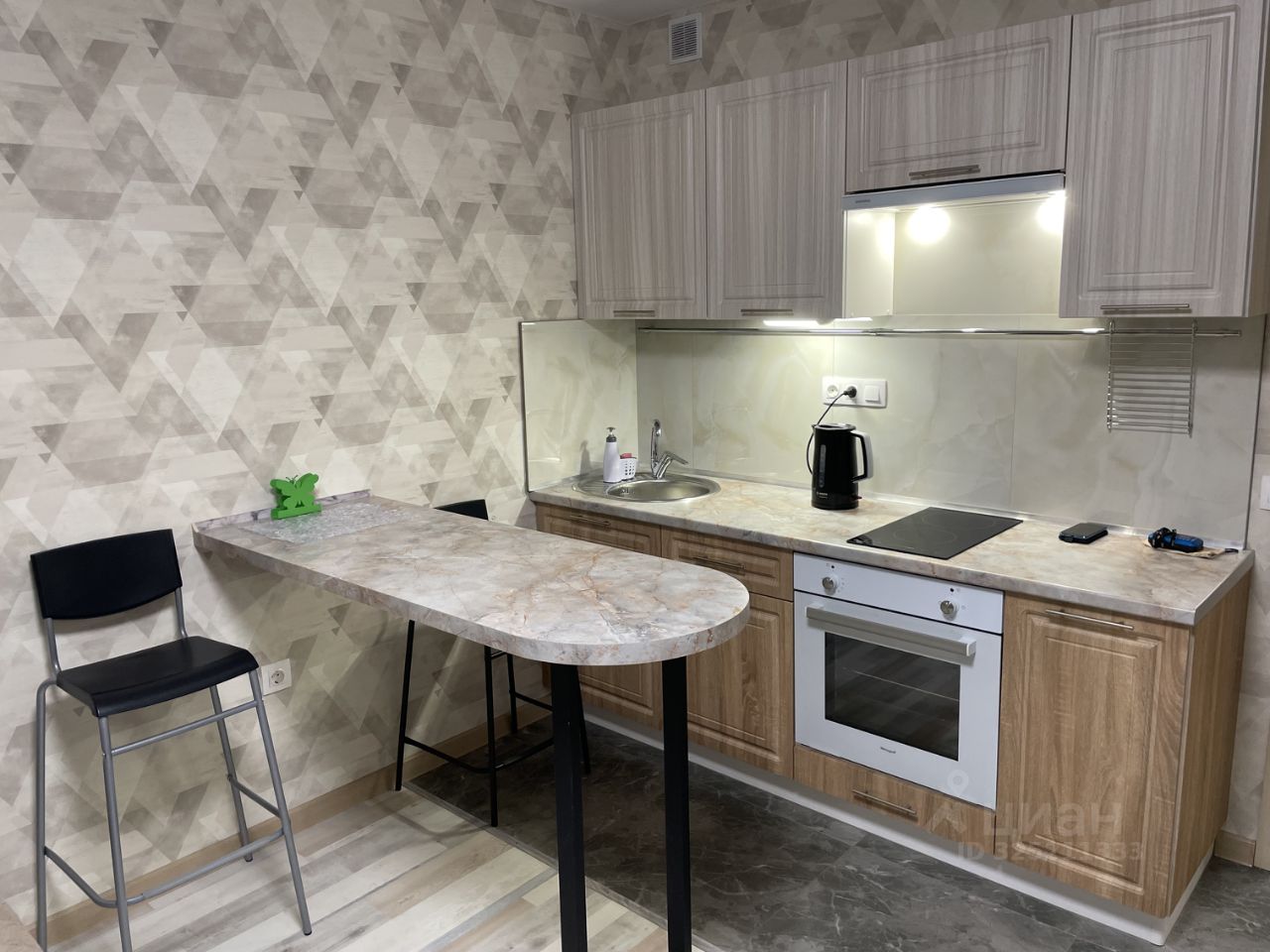 - новый кухонный гарнитур с барной стойкой (+2 барных стула), варочной панелью и духовым шкафом, подсветка рабочей зоны, вытяжка, микроволновая печь и двухкамерный холодильник;