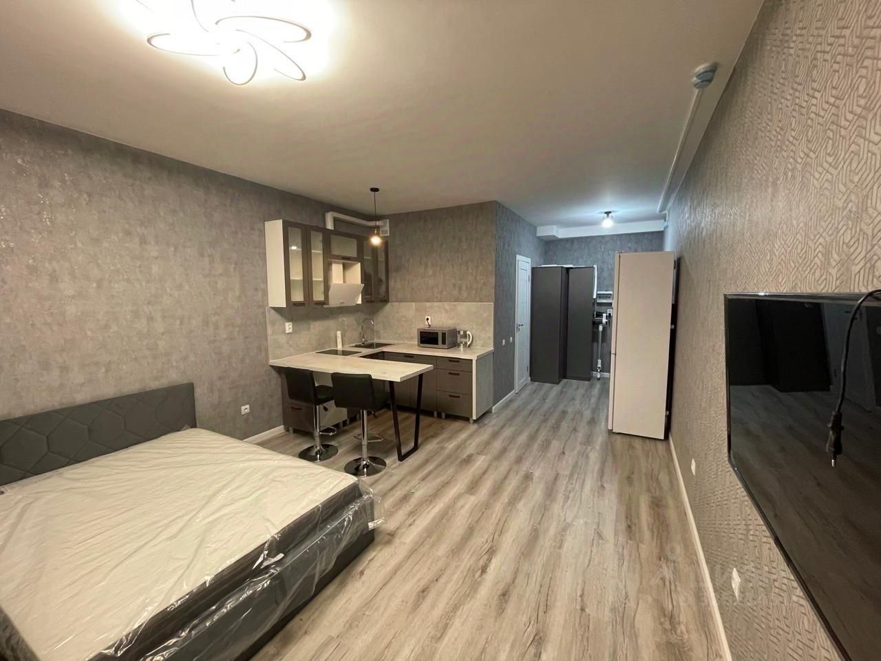 В квартире сделан современный евроремонт. Пространство грамотно организовано: зона кухни оборудована всей необходимой мебелью и техникой, включая холодильник, телевизор и стиральную машину. Комната также меблирована. Ванная комната с полноценной ванной позволяет расслабиться после насыщенного дня. Есть балкон, где можно выпить утренний кофе или насладиться свежим воздухом.