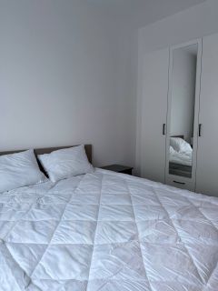 Спальня: Просторная двуспальная кровать с удобным матрасом, подъёмным механизмом для хранения, постельными принадлежностями и прикроватными тумбами. Встроенный шкаф для вещей.