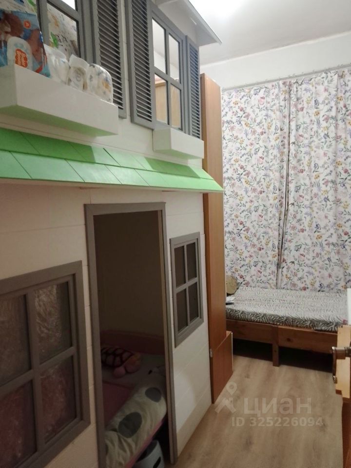 Комната 9 кв м: 2-этажная кровать (длиной спальных мест - 1,7 м), односпальная кровать, комод, шкафы.