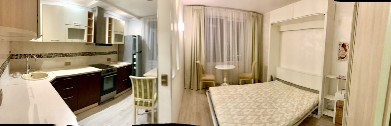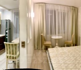 В кухне есть почти вся необходимая бытовая техника , эл печь с духовкой , холодильник, стиральная машинка ,большая кровать- трансформер, в собранном виде превращается в лаконичный шкаф.