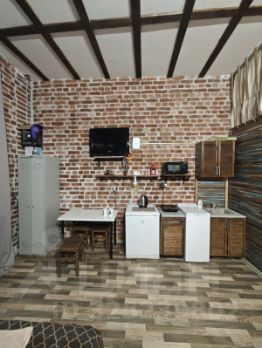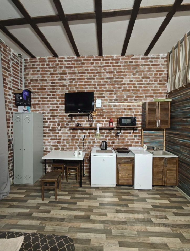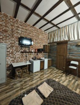 Спальная зона оснащена двуспальной кроватью. В студии имеется телевизор, холодильник, стол, шкаф и мини- кухня.