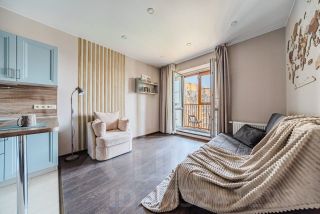 Квартира полностью меблирована - удобные диван и кресло, шкаф купе для хранения вещей, кондиционер для регулирования комфортной температуры.