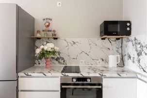 — Кухня с современной техникой: холодильник, СВЧ печь, посудомоечная машина, набор посуды