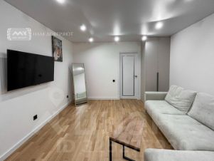стильная гостиная с диваном, большим телевизором и зеркалом в пол 16,5м²
