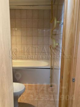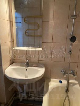 Санузел совмещенный, облицованный плиткой, с ванной, есть зеркало с полкой.