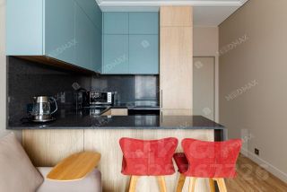 Кухонная зона, оснащена всей необходимой техникой(в т.ч. посудомоечной машиной) бренда Korting. Есть вся необходимая посуда.