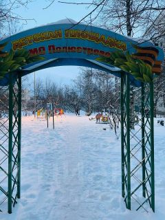 Большой зелёный двор с детской и спортивной площадкой, а также школой.