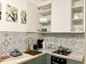 - В кухонной зоне: микроволновая печь, холодильник, плита, чайник, посуда и столовые приборы на любой случай. Чай, кофе, сахар, соль, конфеты.