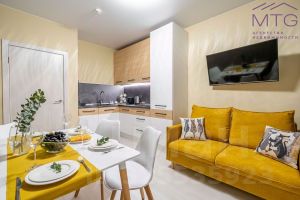 Просторные, светлые апартаменты с двумя большими изолированными комнатами и уютной кухней-гостиной находятся на 9-ом этаже 11 этажного здания с большими окнами в каждом помещении. Укомплектована современной мебелью и встроенной техникой. Есть подземный паркинг (лифт спускается в паркинг), большая парковка вокруг ЖК, видеонаблюдение, круглосуточная охрана, консьерж сервис.