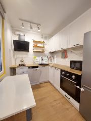 Планировка включает изолированную кухню с функциональной перегородкой, полностью укомплектованную встроенной техникой, включая посудомоечную машину.