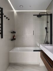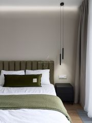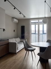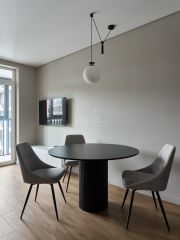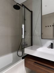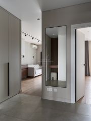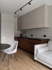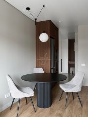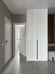 Современный интерьер выполнен с ипользованием премиальных материалов и отражает последние тенденции в дизайне. Натуральные оттенки в сочетании с акцентными элементами создают атмосферу уюта и гармонии. Панорамные окна наполняют пространство естественным светом, открывая живописные виды на городской пейзаж.