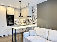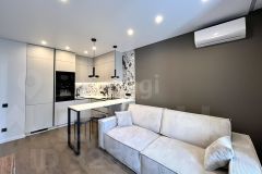 Кухня-гостиная оснащена встроенной техникой: посудомоечная машина, варочная панель, дузовой шкаф, СВЧ, вытяжка, множество места для хранения. Двуспальный диван, телевизор, кондиционер.