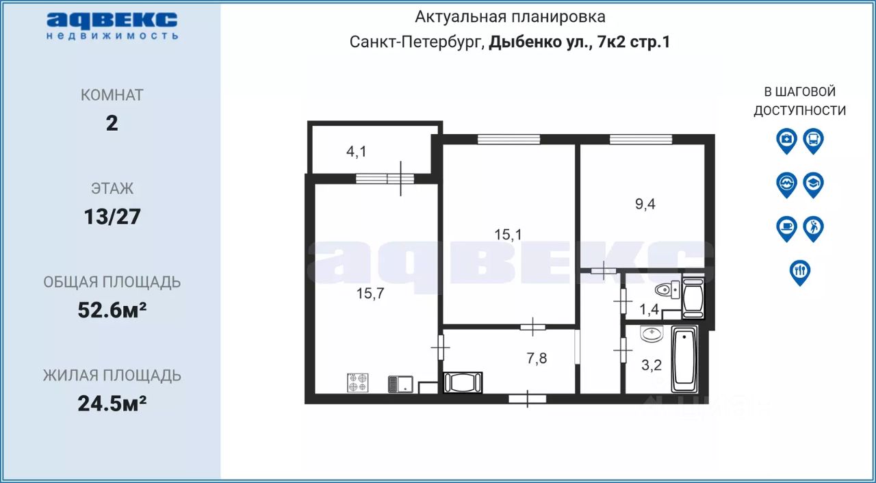 Общая площадь - 52,6 кв.м., жилая площадь - 24,5 кв.м, кухня - 15,7 кв.м