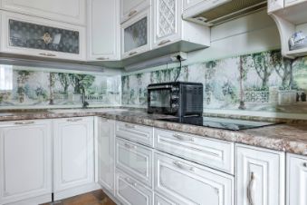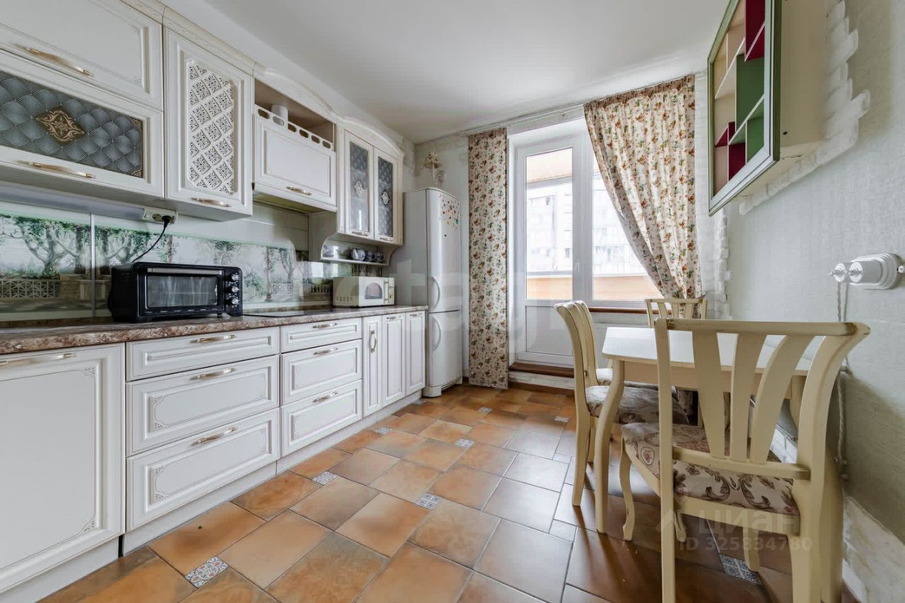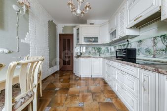 - Кухня с множеством мест для хранения, техникой: варочная панель, посудомоечная машина, СВЧ, вытяжка, электрочайник, холодильник, обеденная зона и выход на первую лоджию.