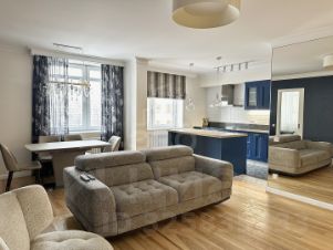 Квартира полностью оборудована всей необходимой качественной техникой для комфортного проживания: посудомоечная машина, духовой шкаф, варочная панель, стиральная машина, телевизор, кондиционер, продуманные системы хранения и т.д.