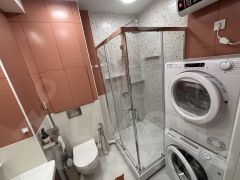 Совмещенный санузел, в котором есть все для комфорта. Качественная душевая кабина, много места для хранения, раковина, зеркало с подсветкой, гигиенический душ.