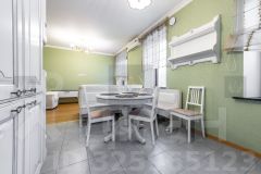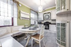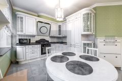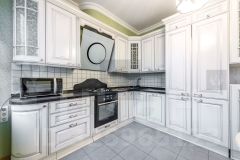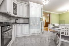 Кухня оборудована всей необходимой техникой: плита, духовой шкаф, холодильник, вытяжка, микроволновая печь