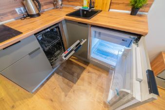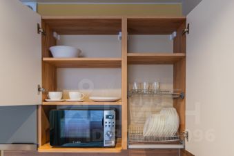 - обеденная зона (холодильник, чайник, микроволновка, плита, столовая группа, посуда на 2 персоны, стол со стульями, посудомойка