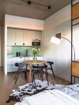 Практичная встроенная техника: мини-холодильник, посудомоечная машина, плита, вытяжка, стиральная машина, водонагреватель, ручной пылесос.