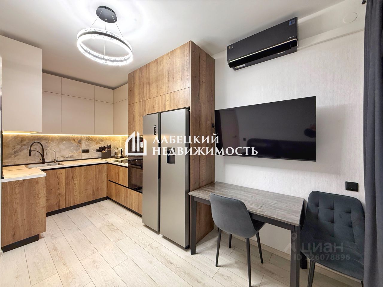 - ДЕЙСТВИТЕЛЬНО комфортная планировка: ПРОСТОРНАЯ комната, в которой расположен диван, большой телевизор, кухонный стол. И отдельное внимание хотелось бы уделить кухне. Она укомплектована всей необходимой техникой, установлена посудомойка, духовой шкаф, варочная поверхность, холодильник.