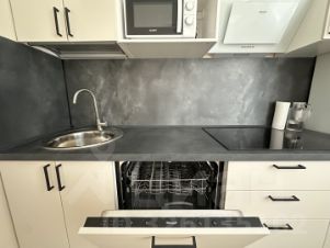 Светлая кухня-гостиная с современным гарнитуром и всей необходимой техникой: варочная панель, вытяжка, микроволновая печь, посудомоечная машина, холодильник. Уютная обеденная зона у окна и качественный раскладной диван.