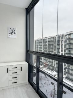 Балкон-терраса: 9 м², полностью сдвижные створки в обе стороны, летом превращается в открытую террасу с видом на город.