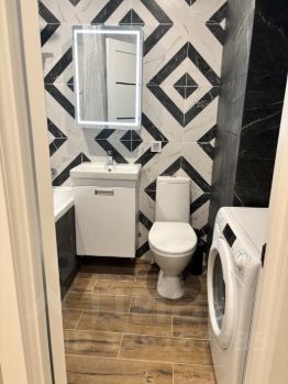 В квартире сделан новый качественный ремонт, вся мебель и техника новые, ранее в квартире никто не жил. Есть всё необходимое для проживания: мебель, кухня (диван на кухне раскладывается, двухспальный), холодильник, плита, духовка, стиральная машина, телевизор, интернет.