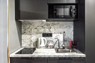 - В кухонной зоне: электрическая плита, микроволновка, вытяжка, чайник, посуда и столовые приборы на любой случай. Чай, кофе, сахар, соль, конфеты.