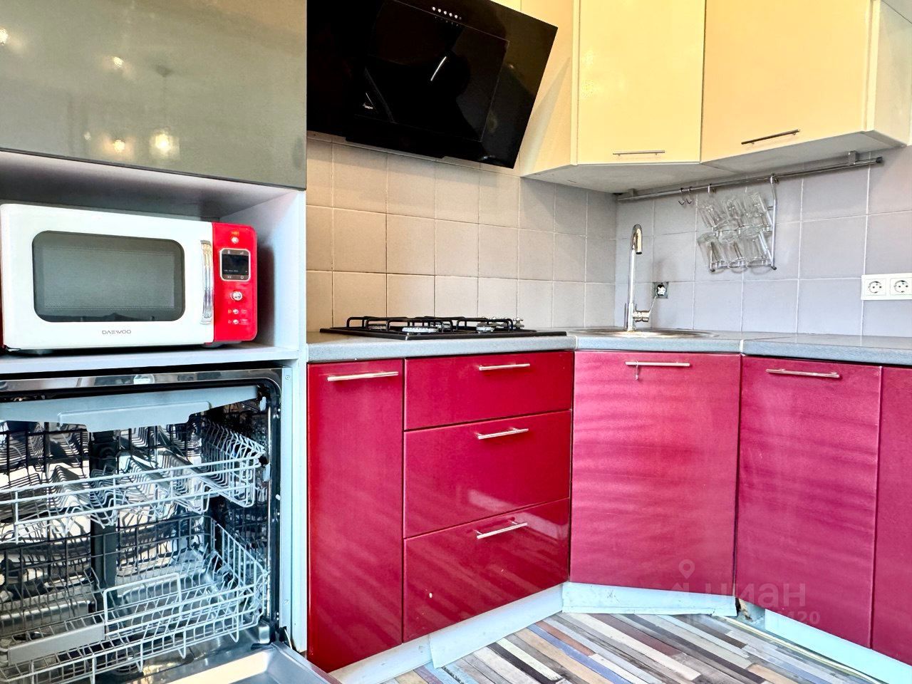 Есть вся необходимая техника: стиральная и посудомоечная машины, холодильник, духовой шкаф, два телевизора (в комнате и на кухне), микроволновая печь.